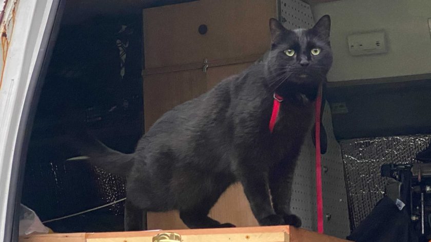 The same goes for Lister. He’s always lived exclusively inside an apartment or house, and never been an outdoor cat. Now, anytime the doors are open (which is basically all the time except when we’re gone or we’re sleeping overnight), he gets hooked to a 25-foot tether clipped to the van. He has that whole radius to run around outside, or to retreat inside. It’s long enough that he can get all the way to the back of the van to use the litter box, or just hide.