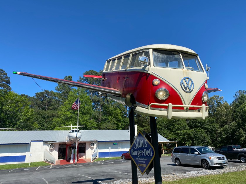 From there we continued north to a Love’s in Waco, where we finally got our long-awaited showers. This is where our bad luck finally turned, perhaps washed away in the shower. From there, it was a short drive up to Sam’s Burger Deli in Rome (Georgia, not Italy). Believe it or not, this was our Harvest Host for the night. Anywhere that has a VW bus turned into an airplane on top of their sign must be cool, right? Not to mention bits and pieces of two other jet aircraft incorporated into the architecture of the place. Inside the walls are covered with pictures of veterans or active military. The food was excellent. We had some appetizers and split a Samburger Philly. While we were relaxing after dinner Sam himself stopped by to introduce himself and say hello. Nice guy, nice place.