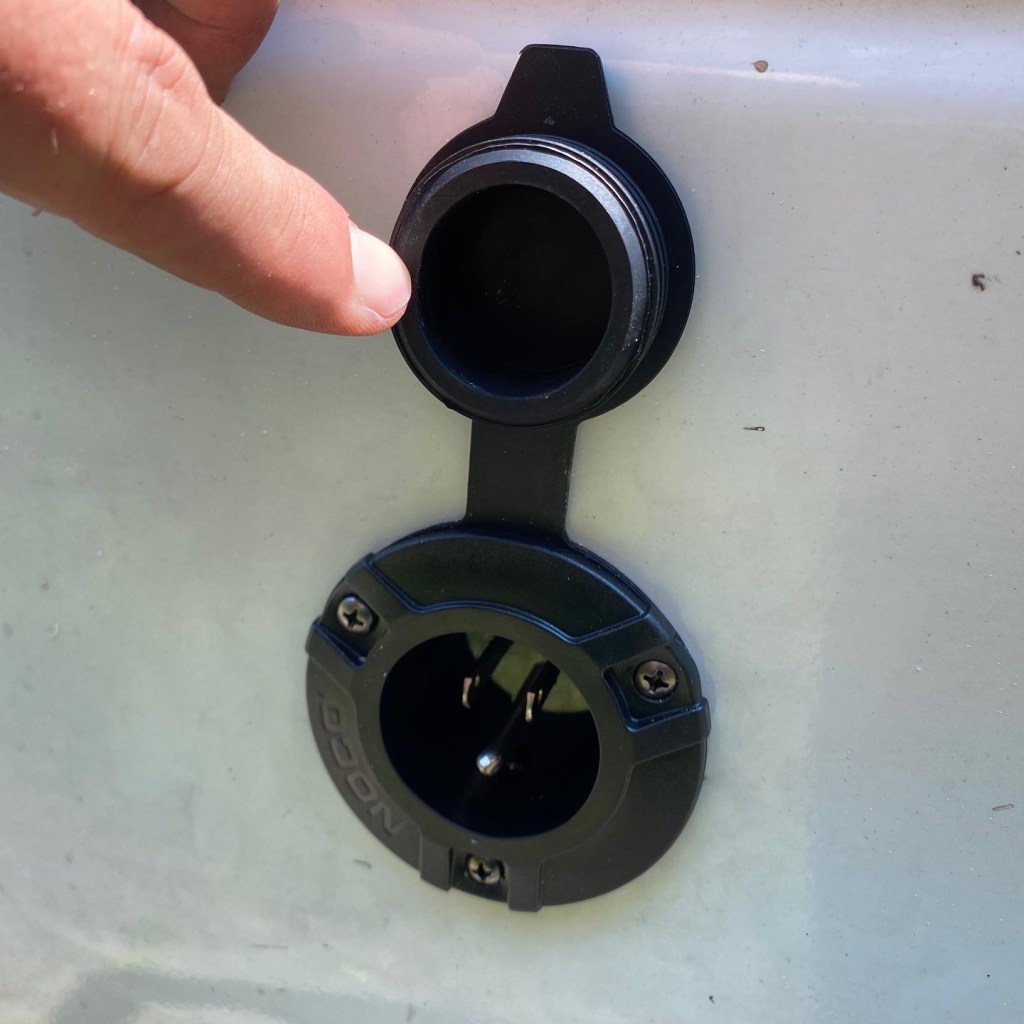 At the same time, I also ordered a Noco power socket. This installs into the side of the van, providing a permanent pass-through for 110VAC power from outside to inside, without running a cord through a door or window. It was super easy to install, though drilling a two-inch hole in the side of my van was a little bit stressful! I leave this plugged directly into the battery charger, already set up for 12-volt AGM batteries. When I plug the extension cord in, the charger turns on automatically and starts doing its thing. I also have a power strip that I can plug in and charge or run additional items if I want, but I don’t have many 110VAC items to run.