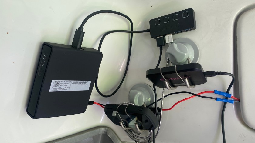 In addition to the hardware itself, it’s also worth mentioning why I installed it where I did. The router came with its own base that attached to the wall. I used Velcro to mount the USB hub nearby, and a pair of soap holders for a shower to hold onto the two hotspots. A couple of rubber bands keep them from falling off on even the bumpiest roads.