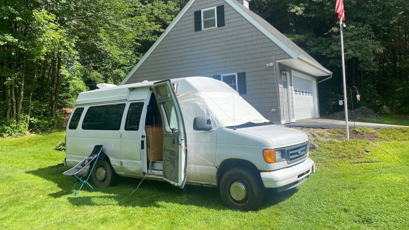 It was a short drive from Jen and Morris’s place to the town of Meredith, New Hampshire, on the north end of Lake Winnipesaukee. Here I’m doing something I never really expected to do: parking in my parents’ backyard. It’s actually one of the nicest places I’ve ever parked. The WiFi is excellent, and I’ve been getting a good amount of work done. We missed out on a yummy barbecue dinner because the place just started closing Tuesdays and Wednesdays, but had a yummy meal from the 104 Diner down the road. My motorcycle even got to sit out last night’s rain in the garage, next to my dad’s tractor and Can-Am Spyder. The driver’s side of the van is next to the garage for easy access to a power outlet to top off my batteries, and the side doors open into a vast expanse of nicely manicured grass for Lister to explore. He’s loved watching birds, chasing chipmunks, and eating the grass. We just have to timeshare the yard between Lister and my parents’ dogs.