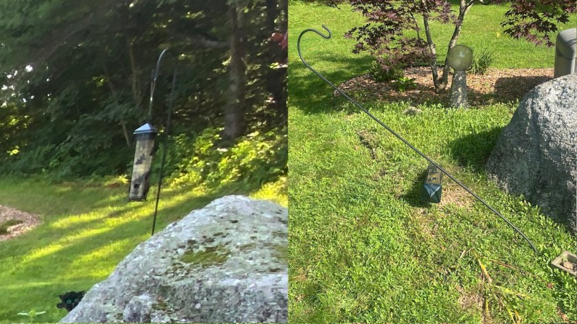This morning, the aftermath was obvious. A bear had bent the pole the feeder hangs on so that it was within reach. Then it removed the feeder and rolled it around on the ground to get the birdseed out, exactly like my parents had described. Did I mention that this happened just 30 feet away from me? I was glad I hadn’t turned my outside lights on.