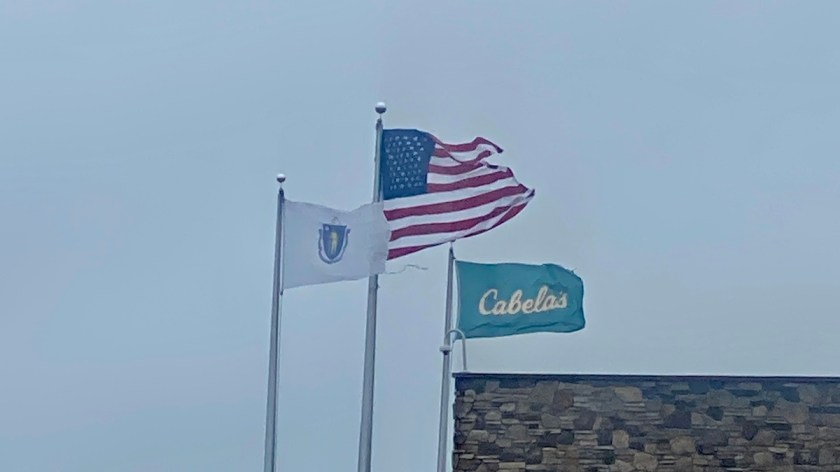 I checked the latest storm track, and it was time to make my move to Cabella’s in Hudson, Massachusetts. That’s right below the B in Boston on this map, squarely in the center of the hook that the storm path should be taking. Winds are strong, enough to straighten out the flags, but far from hurricane force. Gusts shake the van a bit occasionally, but it’s not bad. Similarly, it’s raining steadily and sometimes heavy, but nothing worse than storms I’ve already dealt with.