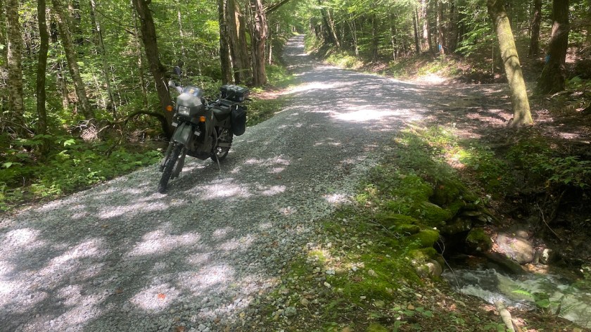 It was as I remembered, an enjoyable ride through the woods. Having ridden it already on my old tires, I could appreciate just how much better the Shinko 804/805s dug into the dirt. This was particularly true on the new loose gravel sections, probably repairs after hurricane Henri. Some sections still had water flowing down them, and even a bit of erosion here and there. But I knew the roadbed was solid enough to feel confident going through it, even a few somewhat deep puddles. As I’d hoped, the new tires simply propelled me through them, rather than the old ones slipping and sliding as they desperately searched for grip they weren’t going to get.