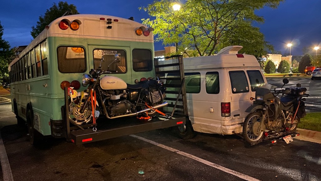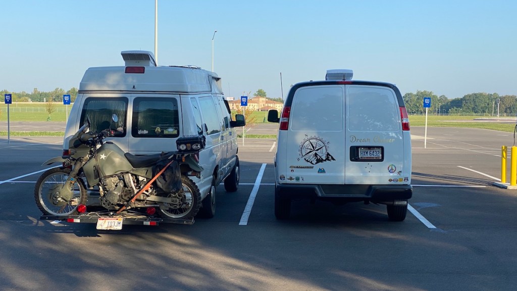 It was time to put some miles behind me, so I drove to a Cracker Barrel in Bloomington, Indiana. I had an enjoyable (as usual) dinner, and planned to spend the night. Imagine my surprise when I came back to my van and found this kindred spirit parked next to me! Reading the stickers, I looked up WhereverIMayRoamBus on Instagram and dropped them a friendly “Hi, neighbor” message. They’re a couple, Maddie and Matthew, with a bus, a bike (Triumph Bonneville, in case you’re wondering), and a cat, Pterabyte. Sound familiar? Unlike my rapid build, they spent the last two years putting this bus together, yet hit the road around the same time I did. Scrolling back their Instagram a bit, I even found pictures of their visit to Jungle Friends, the primate sanctuary Trisha and I stayed at on our way to Bushnell, Florida. It’s a small world, after all.