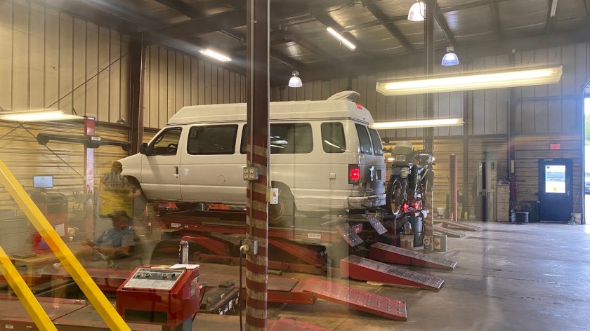 At the top of the list is a new set of tires. The ones the van came with weren’t fresh to begin with, and the miles I’ve put on myself have worn them even more. The place down the road from Meg’s has Goodyear Wrangler HTs in stock, and could install them today, so I went for it. They’re a “highway terrain” tire, optimized for pavement but more capable in light dirt driving than standard commercial van tires. I fully expect to be camping out in BLM land out west, and wanted tires I could be sure would get me there and back to pavement. I won’t be doing any serious dirt driving, though. Going exploring is what the motorcycle is for.