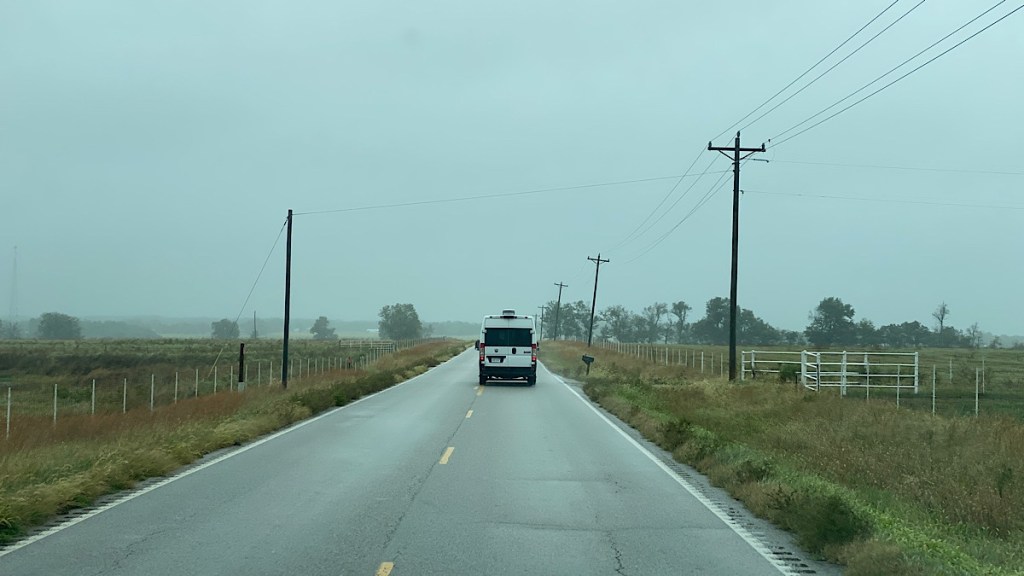 The worst part was the wind, which was quite strong and very gusty. You don’t notice it in a car, but we very much noticed it in our tall vans. Roads like this one have a speed limit of 65 out here, but we didn’t feel comfortable doing much more than 50 with the flashers on. Even at that speed I had a hard time keeping the van in my lane sometimes. Traffic stacked up behind us, so we kept pulling over where we could to let it by.