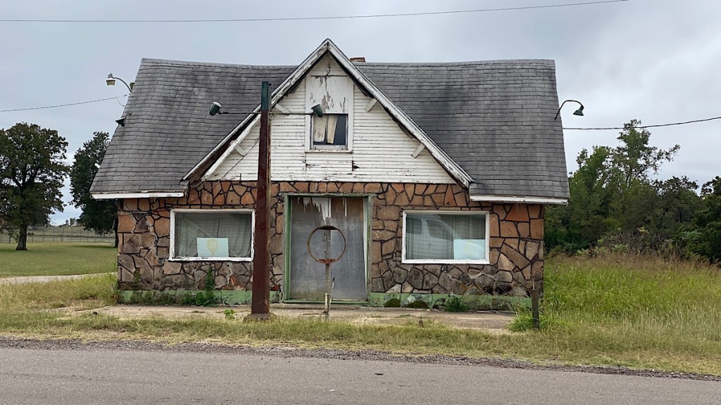 Moving down the road to Luther I stopped at this unassuming looking building. The Threatt Filling Station doesn’t look like much today, but it was an important Route 66 oasis back in the day — particularly for people of color. It was owned and operated by Allen Threatt, an African American who understood all too well the trouble and discrimination that people of color encountered in their travels. He catered to them specifically, and enabled them to continue their own treks down Route 66.