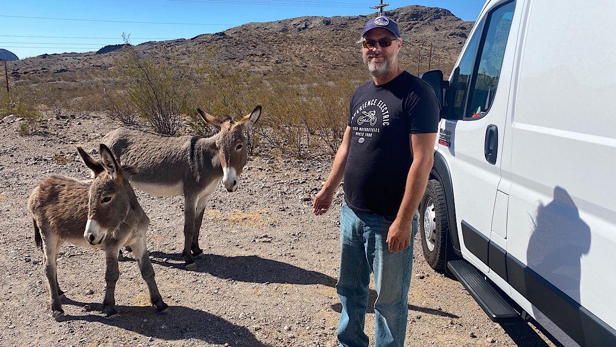 Oatman is also known for the wild burros in the area. The locals say they rarely come into town anymore, but we encountered them both entering and leaving. They’re pretty friendly, but the locals warned us they might attack Birgit and Tom’s dog if they saw her, fearing she might be a coyote. Aside from walking up and down Main Street, they kept her inside the van.