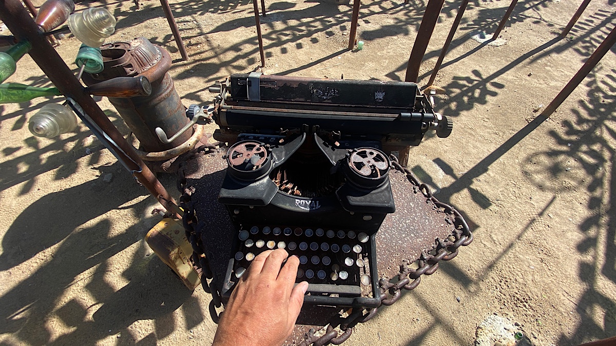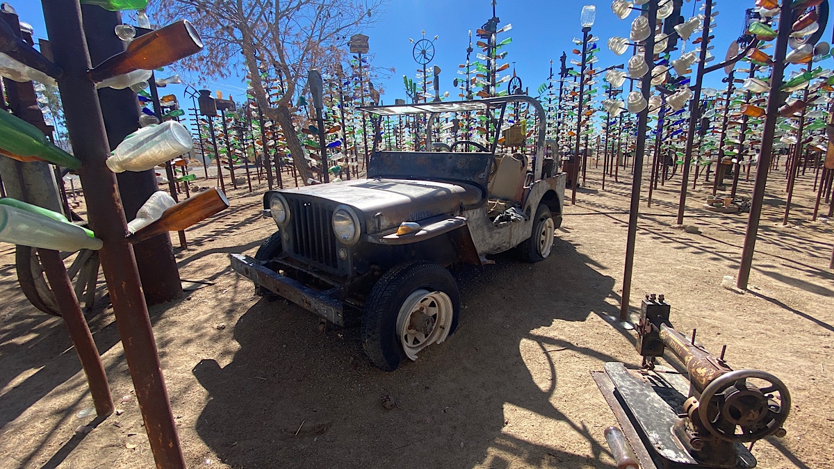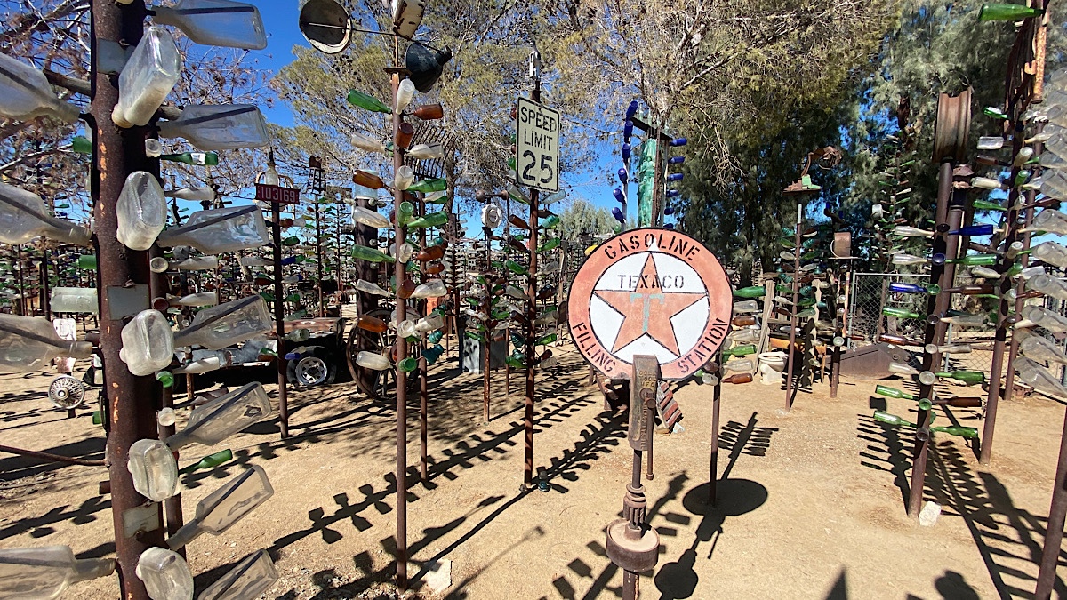 After a short drive I rolled into the small town of Oro Grande, and found Elmer’s Bottle Tree Ranch. Elmer himself passed away in 2019, but his family continues to operate the place, which was open when I arrived. There is so much to see here. My therapist and I were just discussing how while I don’t know much about traditional visual art, I do appreciate some non-traditional forms of it. This proved to be true here. One man’s trash, another man’s treasure, and all that. I spent a fair bit of time exploring, and could’ve spent more.