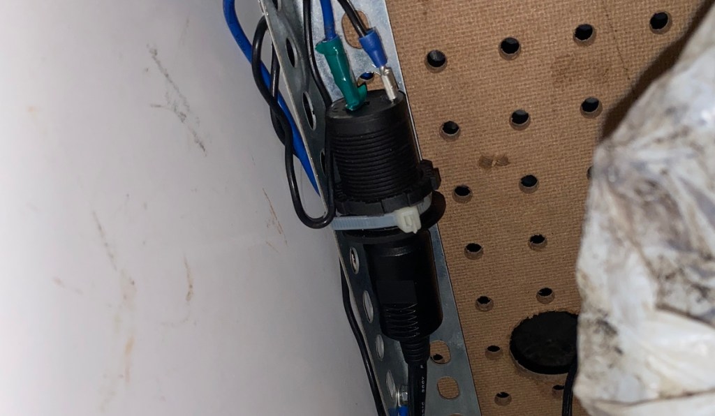 I had two spare outlets. I installed one of them, only to find that the plug for the fridge was too big to fit inside the one I installed. You know how 12-volt outlets are supposed to be one standard size? They’re not. So I had to remove the first outlet and install the other one, checking first to make sure the fridge would actually plug into it. Rather than an outlet on the side of the pantry, I mounted it completely inside this time. The hole that used to hold the outlet is now a pass-thru for the plug to run inside to the outlet, mounted vertically inside one of the supports. This is much more out of the way now and should prevent whatever problems caused the first one to break.
