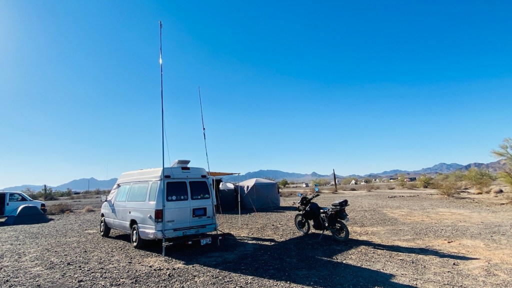 My campsite looks a bit like an antenna farm now, but what do you expect from a ham radio operator? Ironically, it’s the short one that’s my ham antenna — exactly the same setup I used at the top of Mount Washington. The tall one is a fiberglass flagpole with my FastNet antenna on top. I tried putting the ham antenna on there as well, but all that weight up top made the mast lean quite a bit in even a light breeze, so I took it down and went double-fisted instead. As a result, I can only reach the repeater in Parker, 35 miles to the north, and not the one in Yuma, 53 miles to the south, like I used to. I can handle that. I can still hit all of the local Quartzsite area repeaters on low power with no problem.