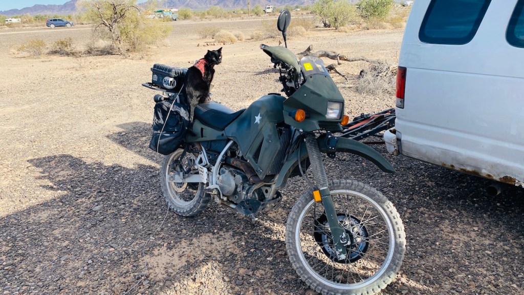 This KLR650 is the absolute perfect vehicle for my current situation. Route 95, the main road into town, is paved and 55 mph, while all of the roads around the BLM land are dirt. It handles both of these quite well, even when the “road” bounces across a bumpy desert wash. It’s great not only for bouncing around different camps around the LTVA, but it also allows me to leave my van parked, with the canopy and antenna masts deployed, rather than having to break down camp every time I need to run into town.
