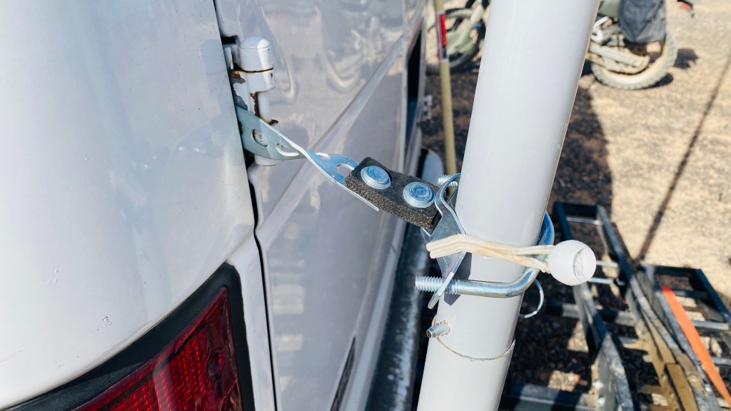 I’m glad I bought a muffler clamp yesterday and turned it into a stand-off support for the flagpole. Yes, it’s missing a nut, but I’m using the bungee to hold the pole to the clamp anyway. I don’t have the angle quite right yet, but I’m not messing with that in this wind. The other end just bolts between the body of the van and one of the door hinges, through one of the three bolts that holds the hinge on. Simple.