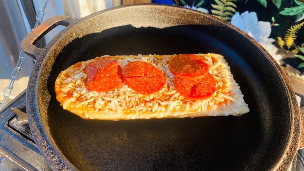 One food I really enjoy that I can’t have often in the van is pizza. Without a microwave or an oven, it’s hard to heat up my own. I could order out — I hear Silly Al’s in Quartzsite is quite good — but even a small pizza is more than I can eat in one sitting, and when it comes to leftovers I’m right back where I started being unable to reheat them. So I decided to try an experiment. I pulled out the cast iron “Dutch oven” pans and tried to heat up a frozen pizza with them.