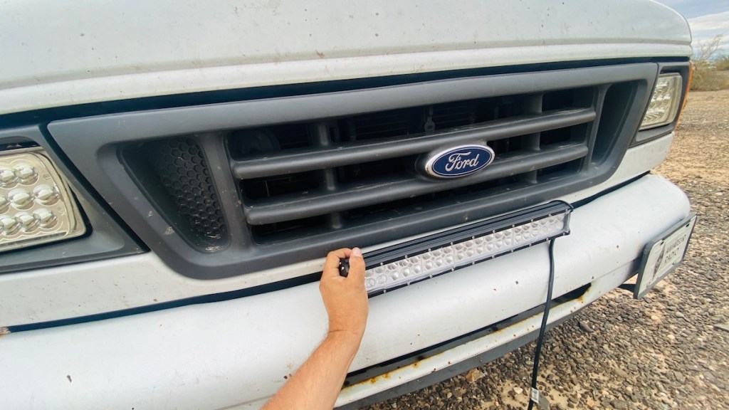 I treated myself to a couple of small presents. I finally splurged for the LED light bar I’ve been wanting. I thought it would fit in the small bumper opening, but once I stuck it in there I realized there’s nothing to mount it to, and it would be much easier to stick it on top of the bumper instead. I also got a two-way switch for it that will let me turn it on, off, or have it switch on and off automatically with my high beams. That way I can run all my lights full blast on a dark desert highway, then instantly flip back to non-blinding low beam if a car comes the other way.