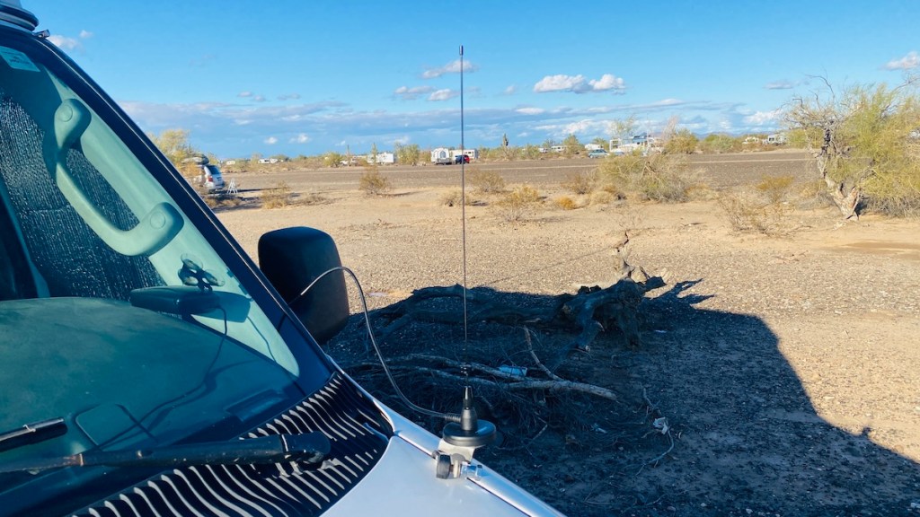 I found an old ham radio I haven’t used in a long time, one for 144 and 220 MHz. That’s an unusual frequency combination since 220 isn’t very popular. It still works fine, though (unlike my 144/440 handheld that I dropped while packing up at Mount Washington), so I programmed all the local Quartzsite frequencies into it, and I’ve started carrying it in my top trunk. If I run into trouble on the trails and I’m out of phone service, chances are I can still squeeze out a call for help on the radio. It could also be fun to ride to the top of one of the local mountains and see how far I can make my signal go.