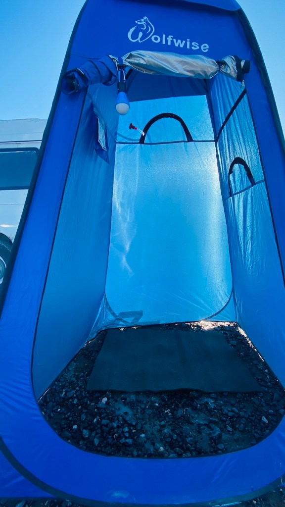 That’s where my secret weapon comes in — a shower tent that Misty gave me. Now we’re getting somewhere. I also bought some good-quality tent stakes to hold it down against the infamous Quartzsite wind.