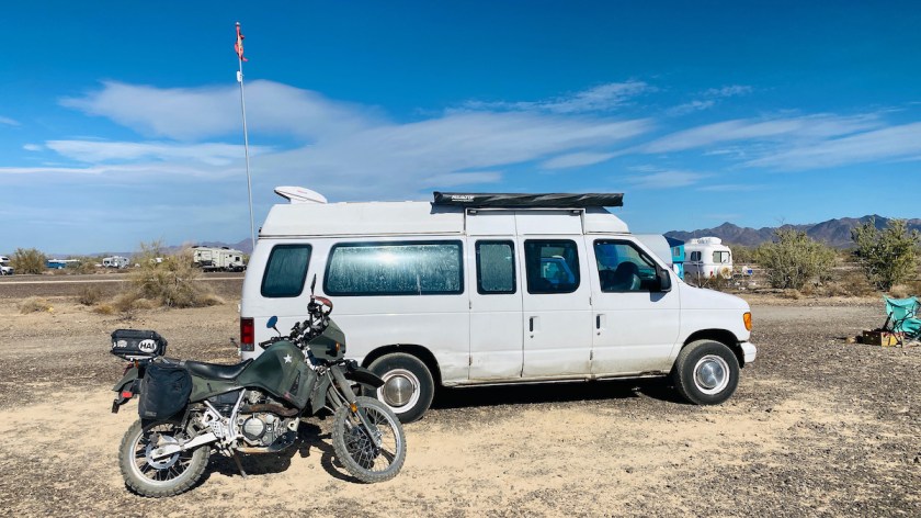 It would be more annoying if I wasn’t about to break camp anyway. On Friday I’m heading south to the Yuma Hamfest, the area’s big amateur radio convention. It’s as good an excuse as any to check out Yuma, which has been on my list of things to do all winter. It’s about as far away as Lake Havasu but in the opposite direction, 80 miles south of here and a straight shot down Highway 95. I plan to pick up a new antenna and mount to replace the one that stopped working along Route 66. I may even look for a replacement HF radio, since my Alinco DX-70 can hear just fine but I haven’t been able to make any contacts since the New England Forest Rally, and I’m not convinced it’s putting out as much power as it’s supposed to be. This is as good a place as any to find one.