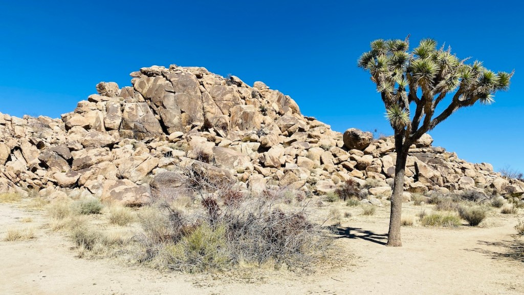 Another advantage of the bike is that it’s much easier to pull over anywhere I want. If I can’t stop in time to check someplace out, a U-turn is simple. Here’s one of the places I stopped and walked to, an enormous natural rock pile with a lone Joshua tree standing there. It’s hard to judge size in a picture, but this tree was about 20 feet tall, which puts it somewhere between 80 and 160 years old (they grow 1.5 to 3 inches per year). This is a pretty average size for a tree in this park, which makes most of them more than twice as old as I am.
