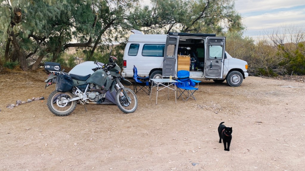 I’ve been able to deploy and enjoy a few things I picked up in Palm Springs. My camp chairs gave up the ghost just as I was leaving Quartzsite, so I bought a replacement. Right next to the chairs, I saw the roll-up camp table I’ve been wanting to pick up all winter. It folds up small enough to stash behind the fridge and gives me a good outdoor flat space that isn’t attached to the van. This morning I sat through a couple of work meetings with the reservoir in the background, making my co-workers wonder if my Zoom background was real or virtual. I’m evil and enjoy teasing them like that.