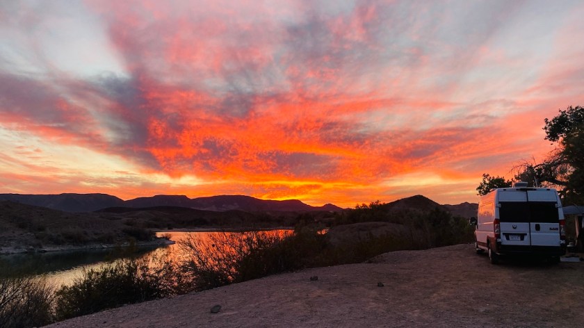 It’s been a hectic several days. I’m glad to have made it back to Imperial Dam to settle in and stay put for a little while. This spectacular sunset greeted me the evening I got back. Wow. Birgit and Tom have been here the whole time I’ve been away. With my consent, they moved into the campsite at the tip of the peninsula where I’d parked my first time here. I wasn’t using it, and this way they wouldn’t have somebody we don’t know going in and out past them constantly. I parked myself in the spot they’d taken upon arrival, directly across the vault toilet. It’s not very busy here, so almost no one except us is using it.