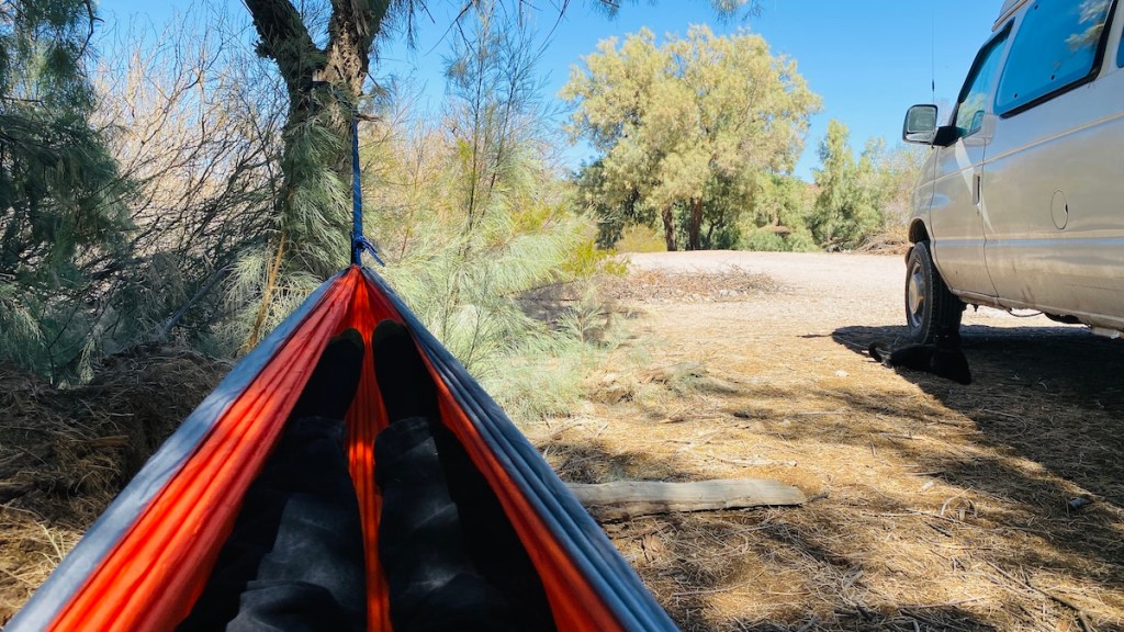 It finally occurred to me that I’m parked next to trees, and I can finally set up the hammock I’d been carrying around for months. For the first time, I didn’t have to use the van as one of the anchor points. I have a pretty comfortable setup behind the van, above the pine needles where Lister likes to lounge. I took a snooze, pondered my options, and didn’t make any real progress on deciding what to do.