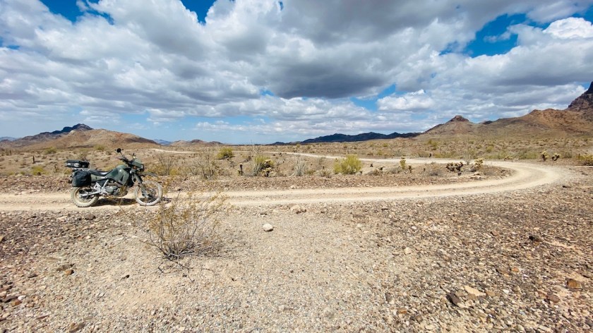 Photos don’t provide any perspective on the wild elevation changes here. This was a difficult descent, followed immediately by a steep incline, with rocks and uneven dirt the whole way. I veered slightly off course on the uphill, and a cactus thorn stuck into my finger, even through my leather gloves. As soon as I got to the top of the hill I stopped to pull it out, take off my glove, and assess the damage. Fortunately, it didn’t break the skin or draw blood. But it was quite painful. I do not recommend riding your motorcycle quite so close to a cactus.