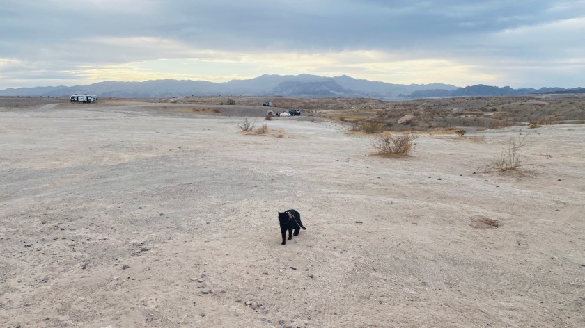 So tonight, we hang out inside the van. Lister did get some outside time before the wind became intolerable, so he’s happy. Tomorrow hopefully I can unload the bike and do some exploring, including riding some of the lake bottom that’s supposed to be underwater, but isn’t right now.