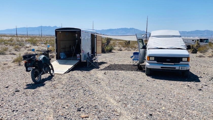 With that in mind, I took the opportunity to join a Homes On Wheels Alliance caravan that just touched down in Pahrump. In fact, they were literally around the corner from me, within sight and walking distance of where I’d originally parked. So I moved and set up my camp like this for the first time. I’d like to pick up an assortment of bungee cords so I can fine-tune my shade cloth setup a bit better, but it’s working great for now.