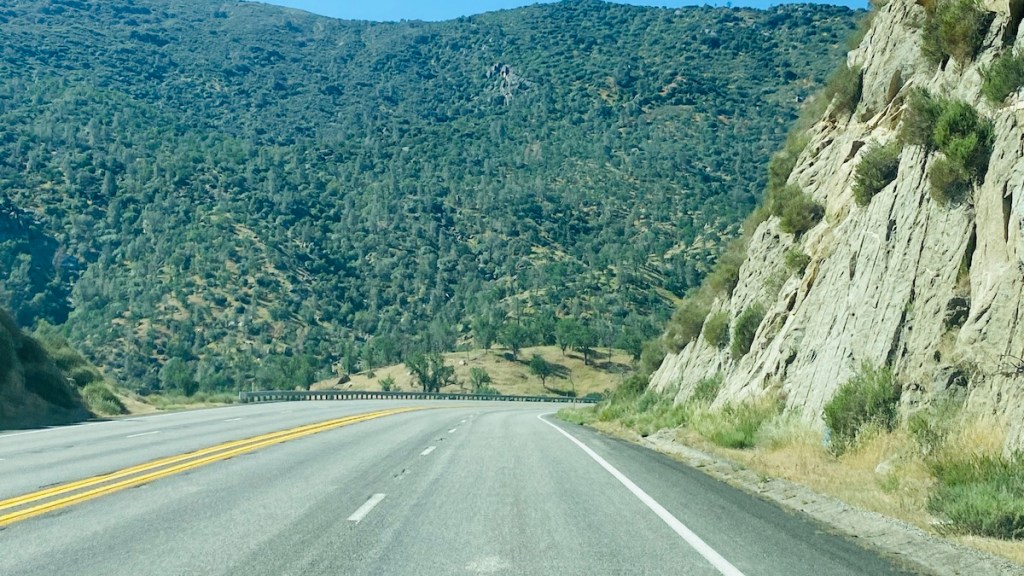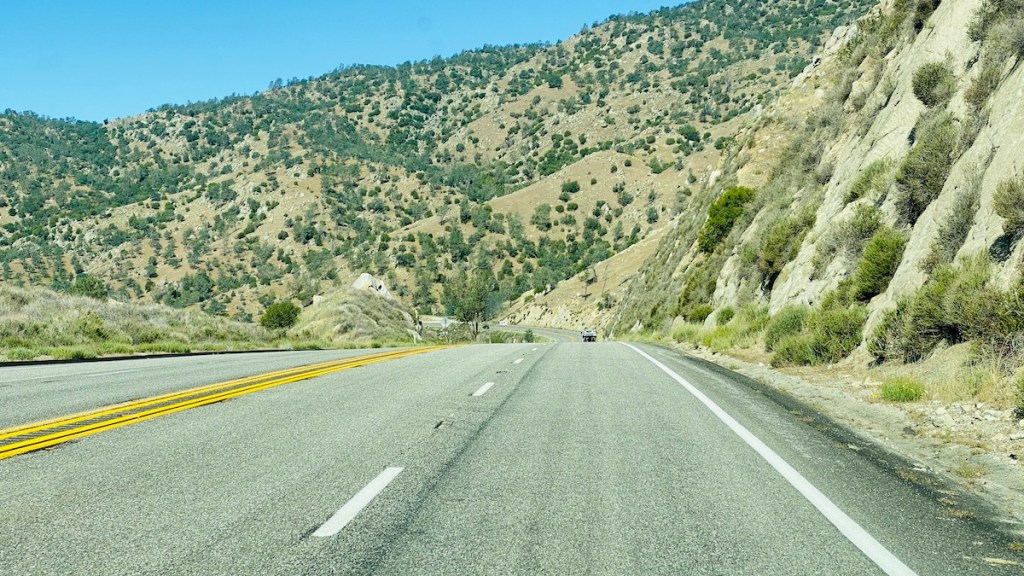 Continuing down the 178 I soon entered Sequoia National Forest. Slowly but surely, after the last mile-high mountain pass, the browns of the desert and mountains started giving way to vegetation. First I passed more dense forests of Joshua trees than I saw in Joshua Tree National Park. Pine trees started to appear, and then the types of trees that I’m more used to from the east coast. Even the ground started turning green as grass appeared on the hillsides. It made me happy.