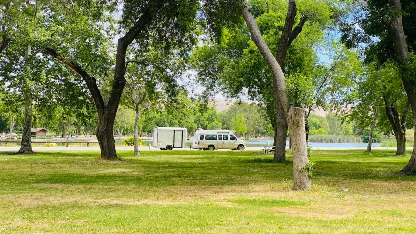 This plan worked well. While there were hills, they weren’t as steep as the ones coming out of Death Valley, so the van handled it just fine. I stopped by the side of Isabella Lake, an oasis of civilization and internet connectivity. Since I work for an east coast company, my co-workers were already online. I was able to get the answers to my questions from yesterday, and get a bit of work done.