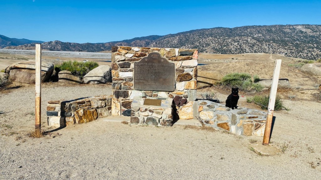 It was also a safe place to let Lister go exploring. He was antsy because I hadn’t let him out before leaving Fossil Falls due to the wind, so this made him happy. At one point he was positively frolicking in the sand, running around in circles like a complete idiot. I can’t say I blame him. For the past few months the ground has been mostly rocks on the desert floor. He was probably thrilled about the soft sand. He also climbed up on this historical monument, claiming it as his own.