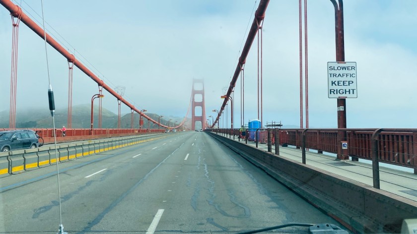 At Yellow Wolf’s suggestion, I hopped on I-280 north, which would take me up through San Francisco fairly early in the morning, avoiding traffic. I’m not much for cities, but since I was traveling up the coast, passing through San Francisco was inevitable unless I made some kind of massive detour. Besides, this route would take me straight over the Golden Gate Bridge, which has to be some kind of major milestone in my travels.