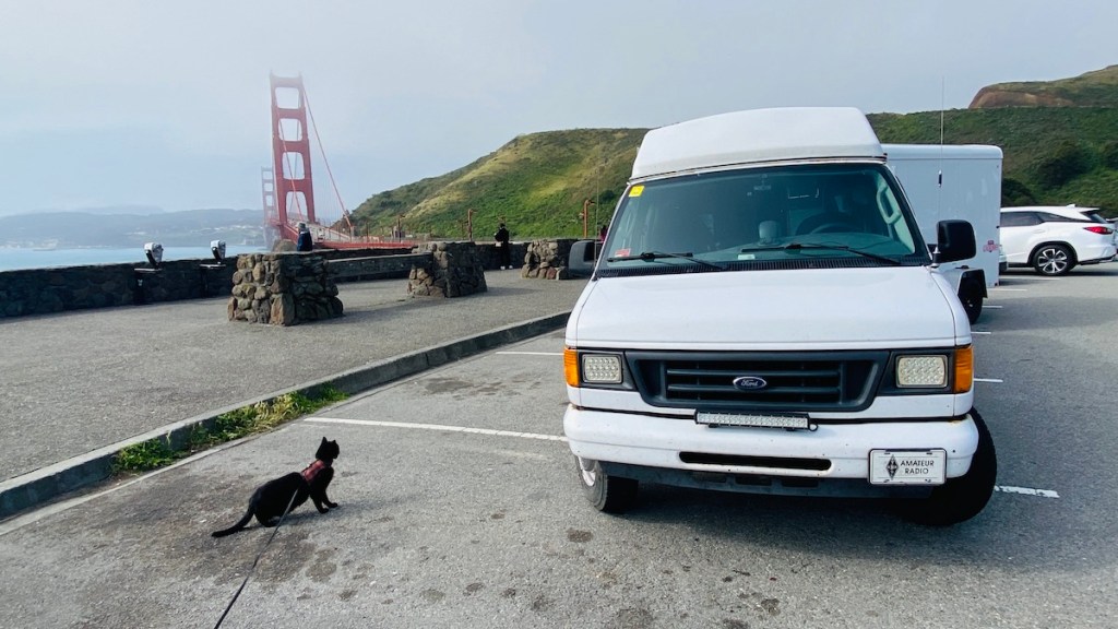 Immediately after the bridge, there was an exit for a vista point, so I stopped to have a closer look at where I had just come from. The bus and RV parking area was full, but the regular car parking area was empty enough for me to make myself a space without blocking anyone out who was trying to park — another advantage of doing this early in the morning. Lister insisted on coming out with me, so I hooked up his leash. He immediately attracted a great deal of attention from attractive women. I’ll have to remember this trick.
