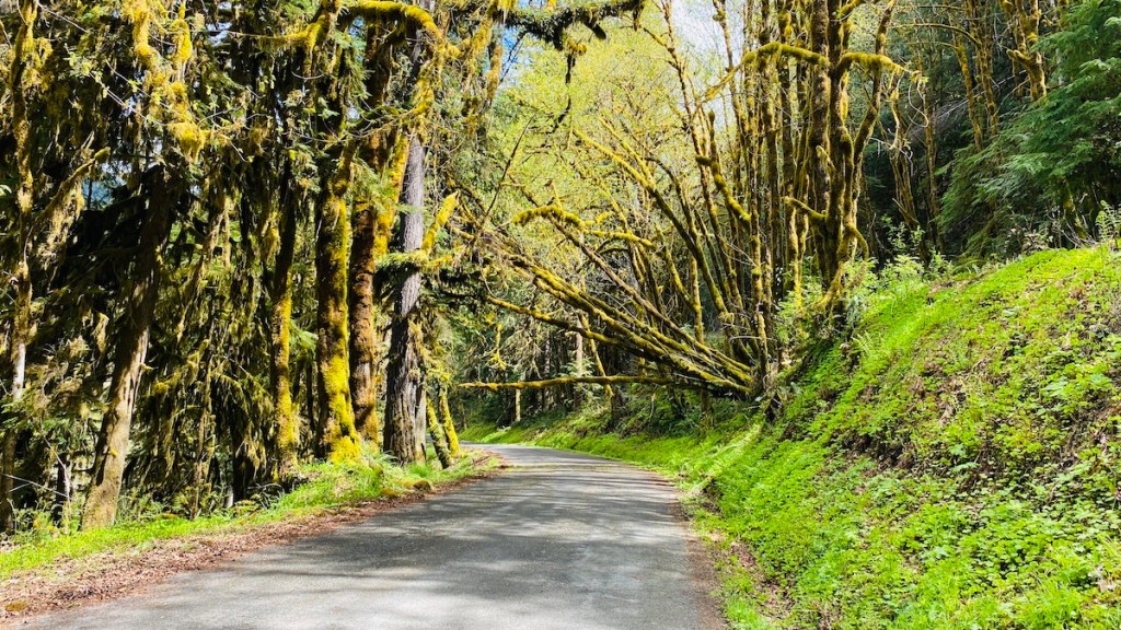 And then there was this view at the bottom of the gravel road where I’d run into snow. I haven’t retouched this photo. The greens really were this bright. The moss-covered trees only added to it. The one stretching over the road made this place feel magical, like something straight out of Lord of the Rings.
