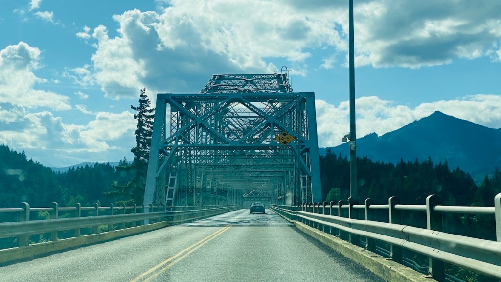 Then it was on to Cascade Locks, another ice cream, and a ride over the Bridge of the Gods. The toll was only $1 for my motorcycle. I did not enjoy the crossing. The height bothered me, and on top of that my tires squirmed on the metal grate road surface. I looked as far ahead as I could, wished traffic would go a bit faster so my bike would be more stable, and made it across safely. I turned left on Highway 14 back toward Vancouver.