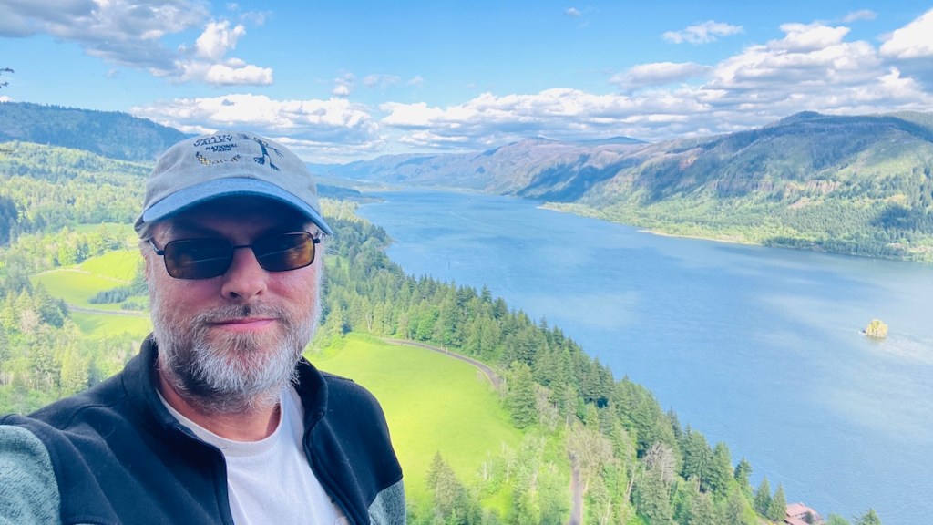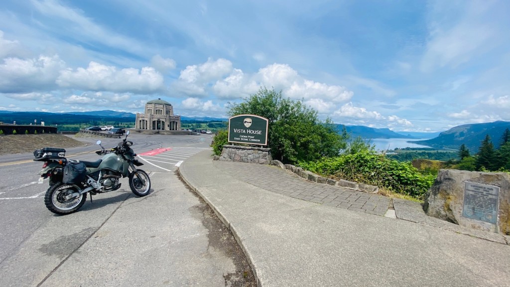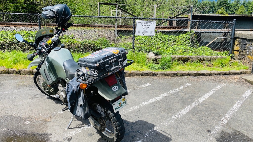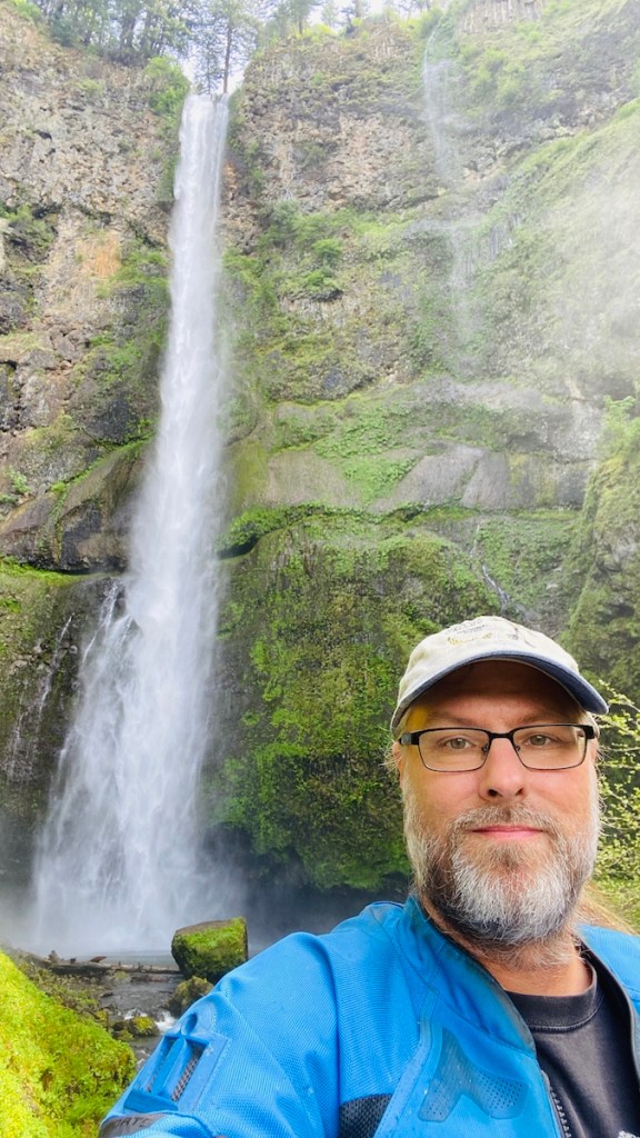 Although it had only been a few days since my last trip, the U.S. Forest Service had started a permit system to limit traffic into and around the waterfall area of the highway. Marilyn had warned me about this and sent me a link to where I could get a permit online. It was only $2, so I bought one while stopped at the Vista House. The ranger who stopped me seemed pleasantly surprised that I was prepared for this, and was happy to scan the QR code on my phone and send me on my way. The highway was quite fun on the bike. This wasn’t a speed run, but it was enjoyable to link multiple corners together in the optimum line through them while remaining in my narrow lane. But there was one place I decided to stop that we hadn’t been able to before: Multnomah Falls.