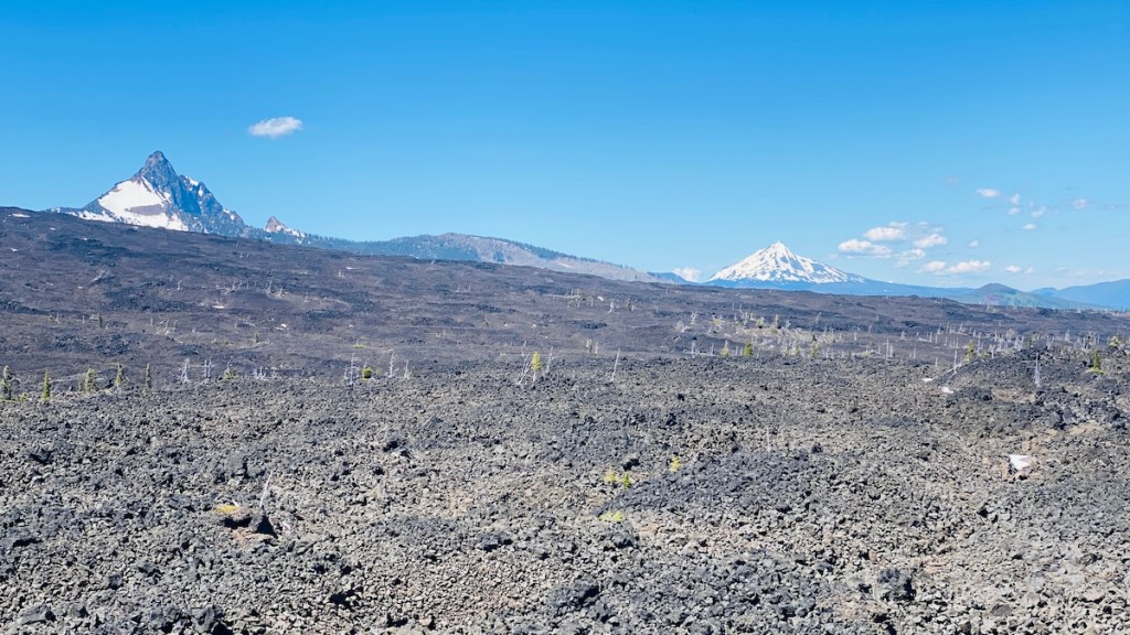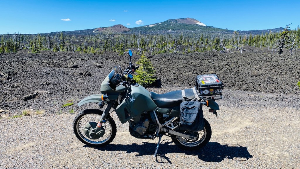 I came around a corner and did not expect to see the forest, or at least what’s left of it, turn into a vast field of volcanic rock. According to the signs I read, the eruption that created this happened fairly recently, about 2,000 years ago — a blink of an eye in geologic terms. That’s Mt. Washington (no, not that one) on the right. I continued riding, constantly switching between the apocalypse environment of a wildfire aftermath to the apocalypse environment of lava fields. It’s a good thing I was on my trusty apocalypse motorcycle for this.
