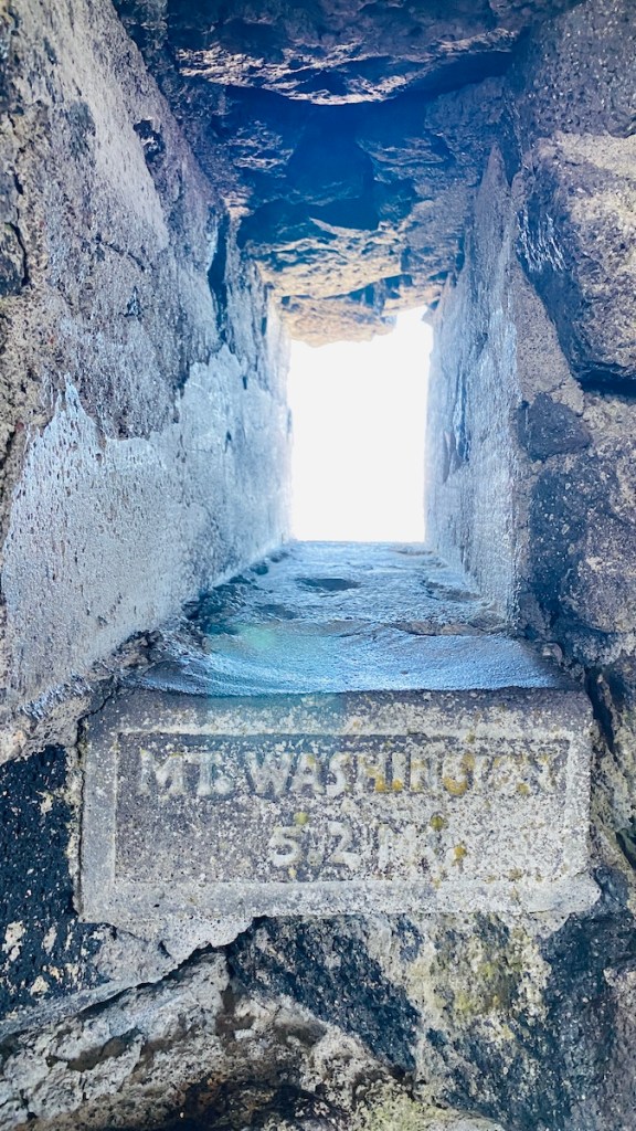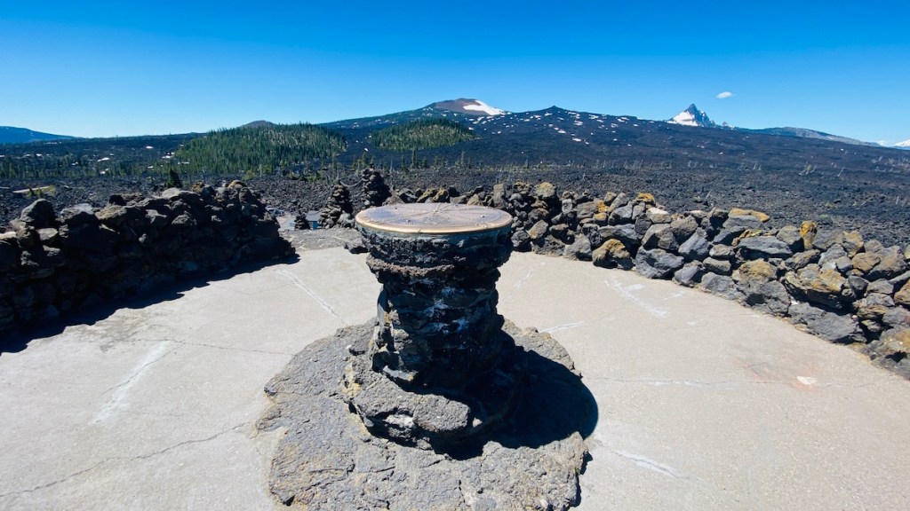 Inside there was information about the observatory, as well as the history of travel across the Cascade Range. The walls had several windows, including numerous small portholes to view each of the mountains and other features of the landscape in the surrounding area. My pictures inside didn’t turn out well because of the vastly different amounts of light inside and out, but you can get the idea. Imagine, instead of a wall of light, a crystal clear view of Mt. Washington, which is what I saw. Other viewports pointed at each of the Three Sisters, Belknap Crater (the volcano that created this lava field), Mount Jefferson, and even Mount Hood, barely visible 78 miles away.