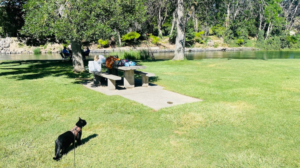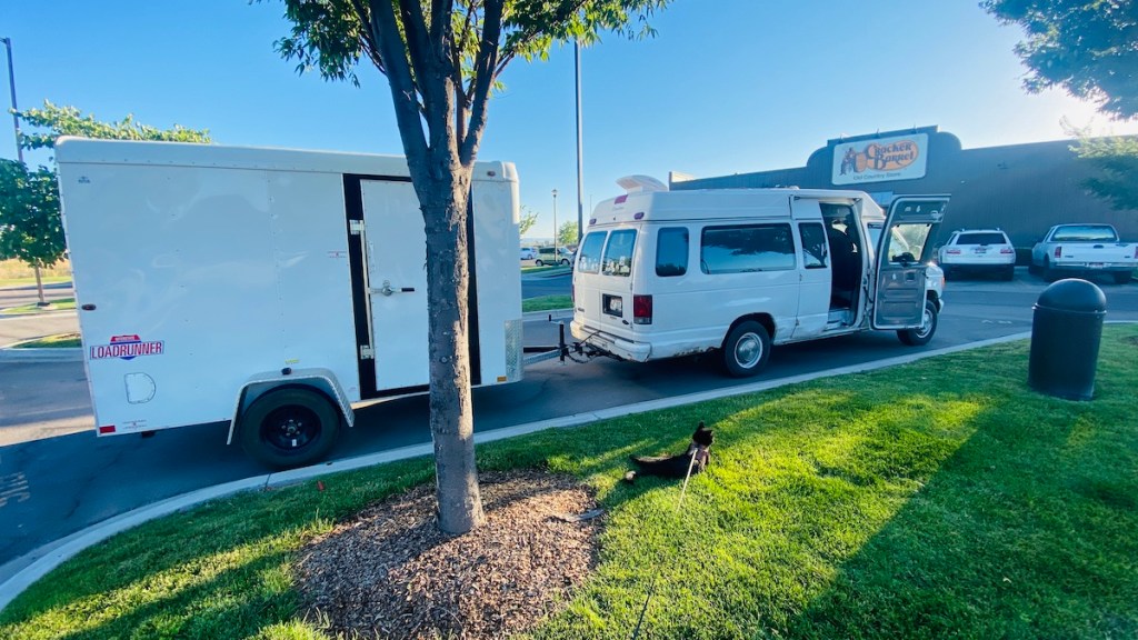 I found a nice park to take him to, hoping a walk, some grass, and some shade would put him in a better mood. He enjoyed it while we were there. A few kids asked to pet him, and of course, I let them. As noon rolled around, the parking lot filled up fast. I felt guilty taking up so much space with my van and trailer, so I packed Lister up and left. He started yowling again. Clearly, no good deed goes unpunished.
