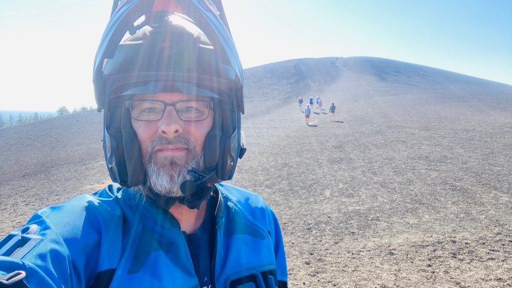 My next stop was the Inferno Cone. I wasn’t about to climb it in motorcycle riding gear, but the next morning I tackled the short, steep climb. I had to stop a few times on the way up, not for my weak foot, but to catch my breath. The top of the cone is over 6,000 feet in elevation, and though I’ve acclimated to the altitude for everyday tasks, the uphill hike put a bit of strain on my lungs, and not with asthma.