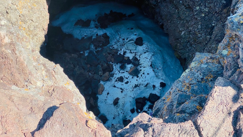 Next up were the spatter cones. Unlike the smooth-sided Inferno Cone, these were literally splattered out of the ground, which gave them their rough appearance. They’re rather porous as well, particularly on the inside where the lava flowed through. You can follow a path to look down into these pits. They never see the sun, which is why on a 90Âş day in late July there was still snow down there. (And some poor guy’s hat.)