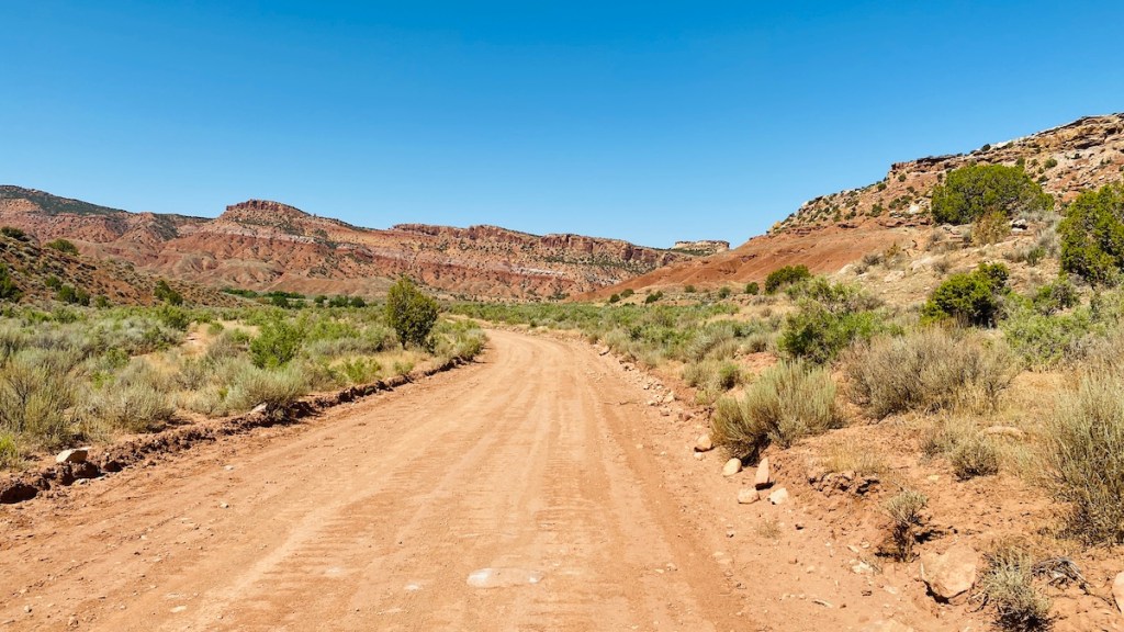 These may have been county roads, but they were pretty rough in places. It was nothing my KLR couldn’t handle, but I wouldn’t want to take my van down them. It was a fun ride but a steep descent into the valley as well. I spent a lot of time in first gear, using the brakes to manage my speed as well. The dirt changed from brown to red as I descended. I felt like I was in an eveRide video, since the landscape looked the same. He’s in Utah as well. In the end, I started seeing signs for sights in the park. Finally, the road turned back to pavement, and I was on the road leading back to the campground. It actually went through! I have no desire to ride it again, but the adventure was definitely worth it the one time.