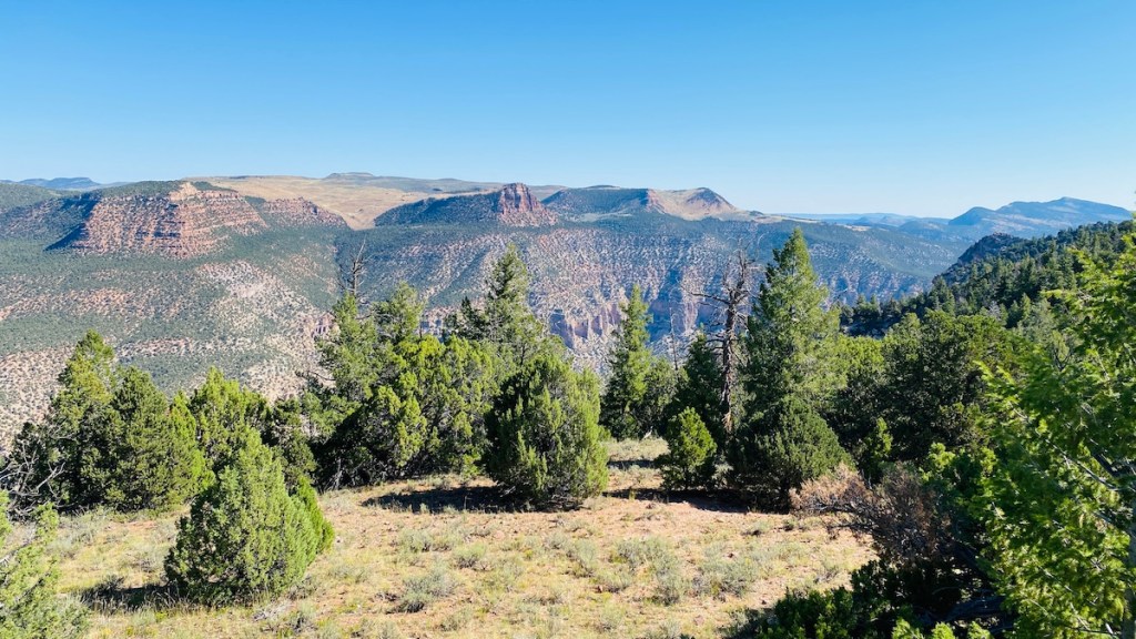 One overlook gave an amazing view of the unimproved 4×4 roads leading off to the east. There are two main ones, Echo Park Road and Yampa Bench Road. Echo Park Road leads 12 miles to Echo Park, a dispersed campground in the middle of the canyons. Yampa Bench Road goes 18 miles off of that toward the southeast corner of the park, with dirt county roads leading back to US 40. That seemed like it would be an all-day trip (18 miles doesn’t seem like much until you’re riding over rough terrain, then it takes a while), but Echo Park would be a fun out-and-back trip that would only take a couple of hours. Unfortunately, I didn’t have time to do it today, since I had to move campsites. I had a plan for later, though.