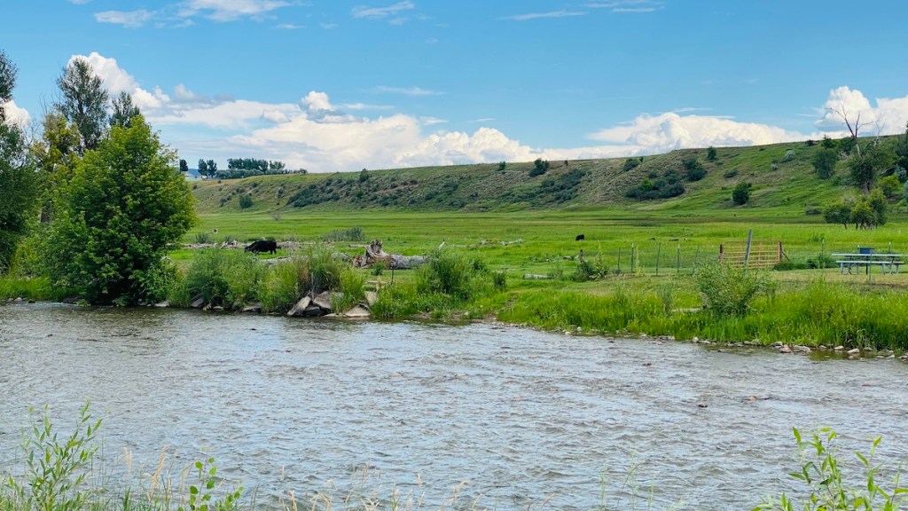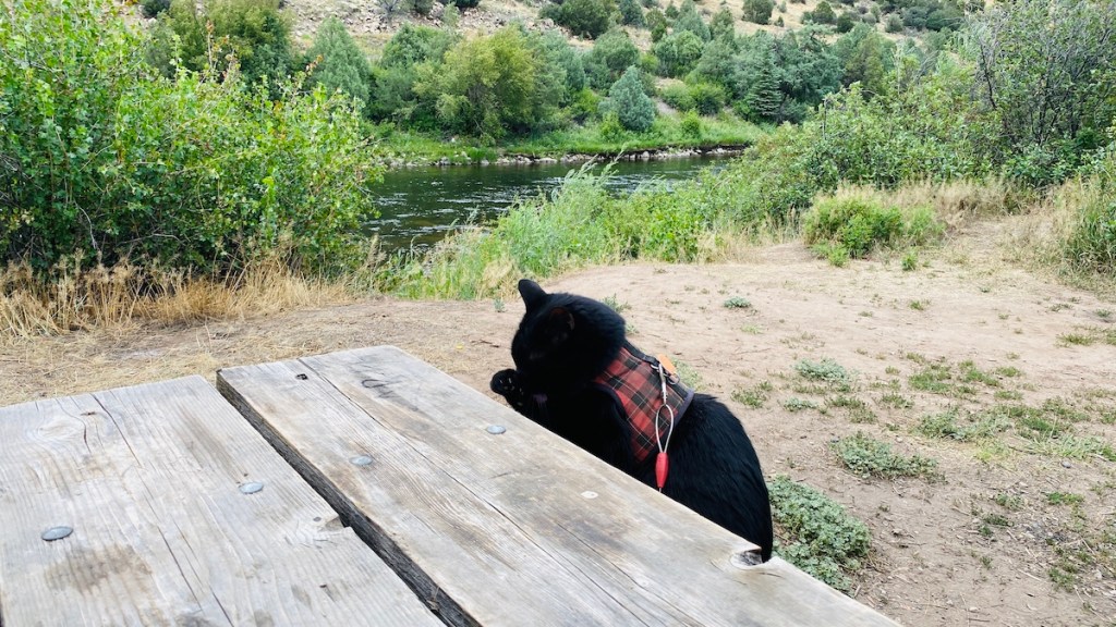 My actual destination was Meeker Town Park, about two hours from Dinosaur. I go to town parks all the time, but you’re usually not allowed to park overnight. Meeker is an exception to that rule. For $10 you can get a tent site, or $20 for an RV with electrical hookups. There’s also an RV dump station available. I had room to pull straight into a corner space right next to some picnic tables and grills. These parking spaces are extra long, and I was able to fit without even blocking the dumpster. The White River flows right through the middle of the park. Cows grazed on the other side. It was strangely soothing to hear their occasional moos. Lister absolutely loved the grass.
