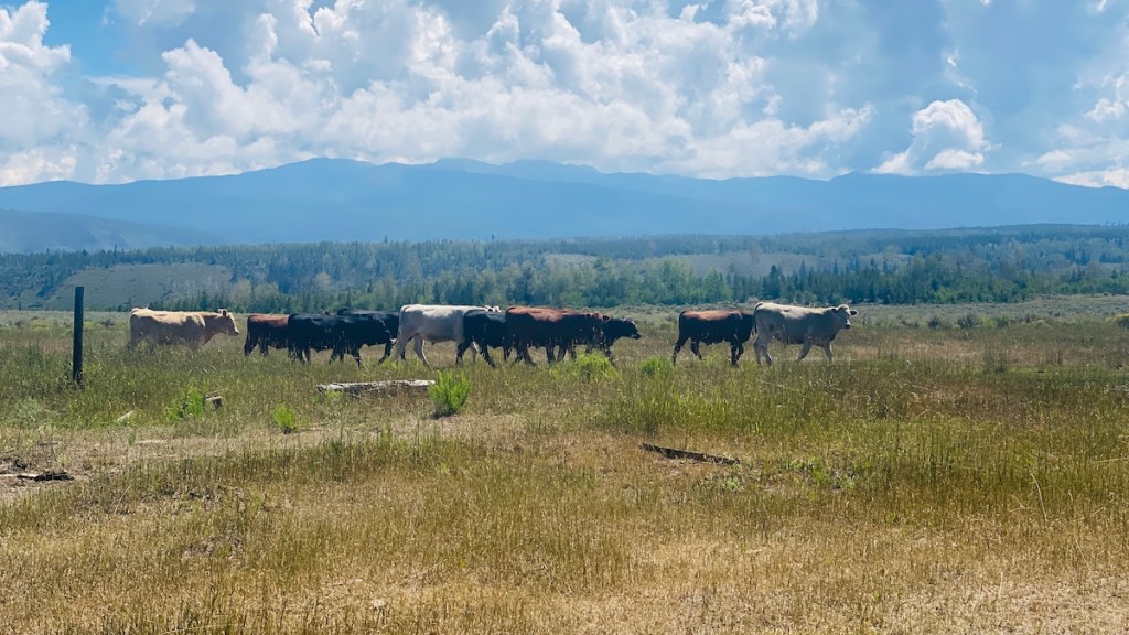 I can say that we’re still on public land (there’s a lot of that around here) and that they allow ranchers (there’s a lot of them around here, too) to let their cows roam freely and graze here. Since we’re both allowed to be here, there’s bound to be some intermingling at times, which is exactly what happened yesterday. You might say we’re all outstanding in our field.