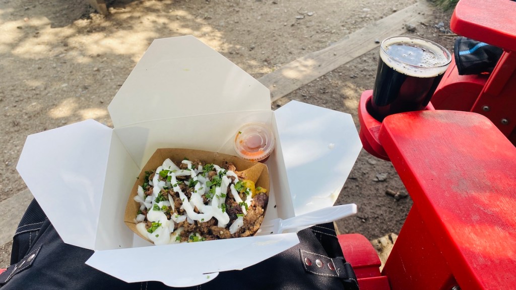 I stopped for gas and saw a trailer for Shreddy’s Tacos within sight. It was parked right in front of Fraser River Beer Company. Stopping for lunch was a no-brainer. I had a walking taco and a Byers Peak Brown Ale. I don’t usually drink at all while I’m riding, but one low-alcohol beer along with food wouldn’t mess me up at all.