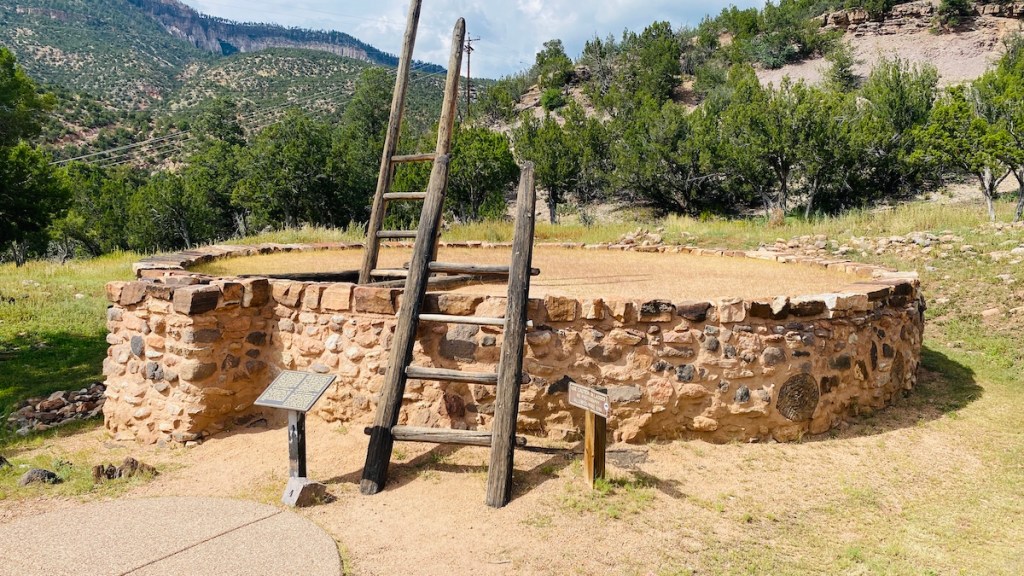Back to peaceful purposes, this is a restored kiva, which was used for ceremonies and social occasions. They’re sacred spaces and photography is not permitted inside, a request that I respected. You can see drawings of the inside here. I did climb down there, though, which is allowed. Spiritual purposes aside, I could see how an underground space like this would remain a comfortable temperature almost year round. Being underground keeps it comfortable on hot summer days, while a fireplace near the entrance would keep it warm in winter, and smoke would simply rise out of the ladder opening.