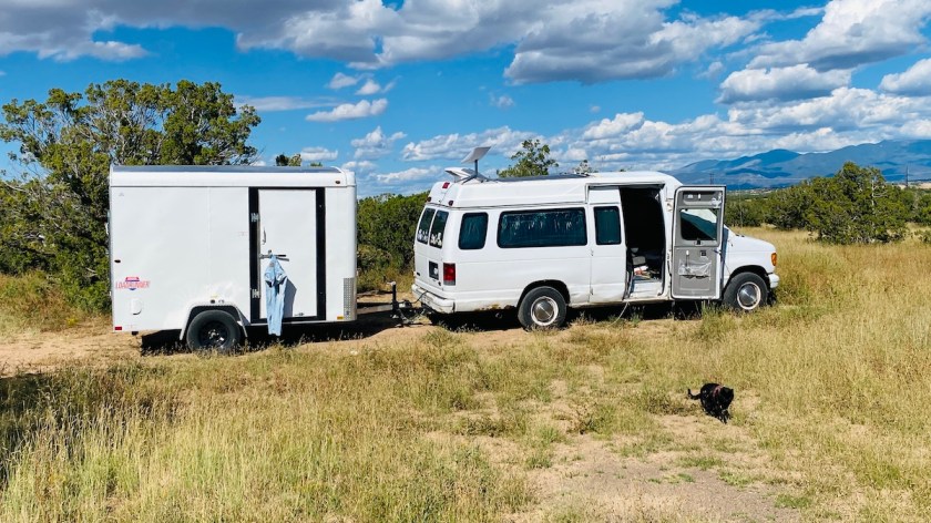 After errands, I made my way to a free campground in Santa Fe National Forest just outside town. Despite being a “forest” there were few trees and little shade. At least Starlink would work. I set up camp and had a pleasant evening. Lister enjoyed exploring and eating some new grass as well.